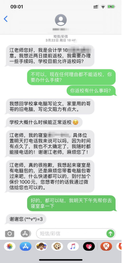 “老师,我的电脑放在寝室里,毕业论文和复习资料都在电脑里,可以麻烦您帮我寄过来吗?””对的,老师这就是我桌子”“电脑包在桌子右下角的柜子里,对的,数据线也麻烦一起寄给我吧。”这是近日来学工一线老师们的常态,通过视频、电话等方式化身“云快递”,在学生的授权下,走进学生寝室,确认邮寄物品,联系快递,将温暖送递给宅家的毕业生们。