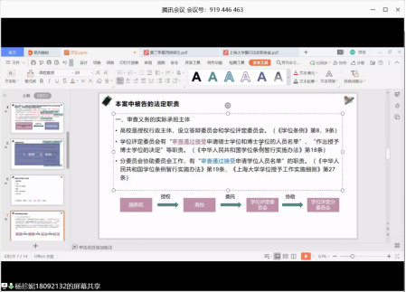 第一位报告人是来自法学181班的沈佳雯同学。沈佳雯同学先柴丽杰案做了概括性地介绍,并阐述了其认为的案件争议焦点。随后从“柴丽杰的学术论文是否达到标准及其与学位论文是否具有相关性”“应当适用学校科研标准还是学院科研标准、学院是否有资格另行制定科研量化指标”“正当程序原则的在本案中的运用”等三方面对柴丽杰案进行了评析。沈佳雯同学结合相关法律规范及被告方自行制定的《学位实施细则》等文件进行分析,认为学术论文与学位论文的相关性主要表现为一种专业的相关性,而在柴丽杰案中应当适用学校的科研标准。另,针对本案中学位评定分委员会审查及通知过程中存在的程序问题,从评定人数、是否应当组织审查和结果告知形式等角度切入进行分析,认为被告的做法违反了正当程序原则。此外,沈佳雯同学还针对“学术自治与法律的关系问题”“履行法定职责案件的诉讼要件”提出了自己的一些思考。