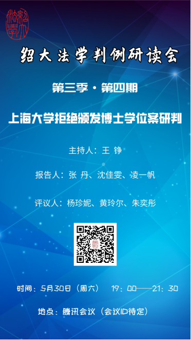 5月30日晚,判例研读会第三季第4期通过腾讯会议平台如期举行。本次判例研读会由王铮同学召集并主持。研读的判例是柴丽杰诉上海大学履行法定职责案(以下简称柴丽杰案),由沈佳雯、凌一帆、张丹同学做报告,黄铃尔、朱奕彤、杨珍妮同学做评议。法学18级、19级同学,法律系教师,共三十余人参与研读。