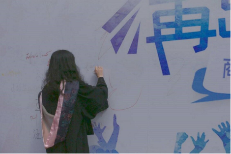 上午8:00,集体毕业照拍摄正式开始,以班为单位有序进行。为确保防疫措施到位,所有毕业生在进入拍摄之前,严格按照疫情防控指南,进行测温并全程佩戴口罩。各毕业班同学依次走上台阶,随着摄影师的手势和指令,将最美的笑容定格在了商院门口。拍摄完成后,大家带起口罩,纷纷在照片墙上签下自已的姓名。这种带有仪式感的设计,让毕业生感到这个毕业季并没有因疫情而变得平平无奇,反而是更多了一份惊喜、多了一份特殊的纪念。