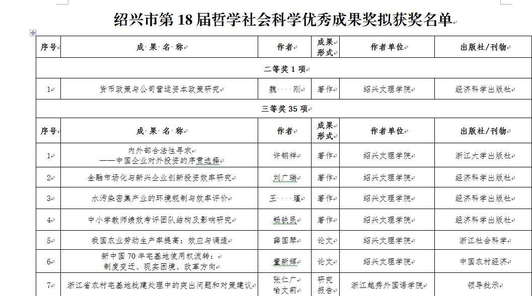 近日,绍兴市哲学社会科学规划评奖领导小组办公室公示绍兴市第18届哲学社会科学优秀成果奖拟获奖名单,全市获奖成果共50项,我校18项成果获奖,获奖率占全市36%。其中永利官网获奖8项,二等奖1项,三等奖7项。