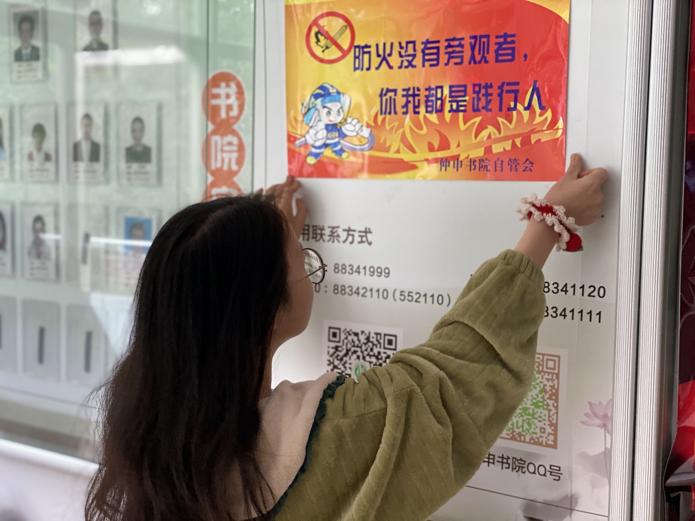 为了巩固强化校园防火的安全精神,提升全校师生对自然灾害以及突发事件的应对能力,切实做好校园安全防护工作,近日,仲申书院自管会组织20级新生积极筹划张贴消防安全标语的活动。