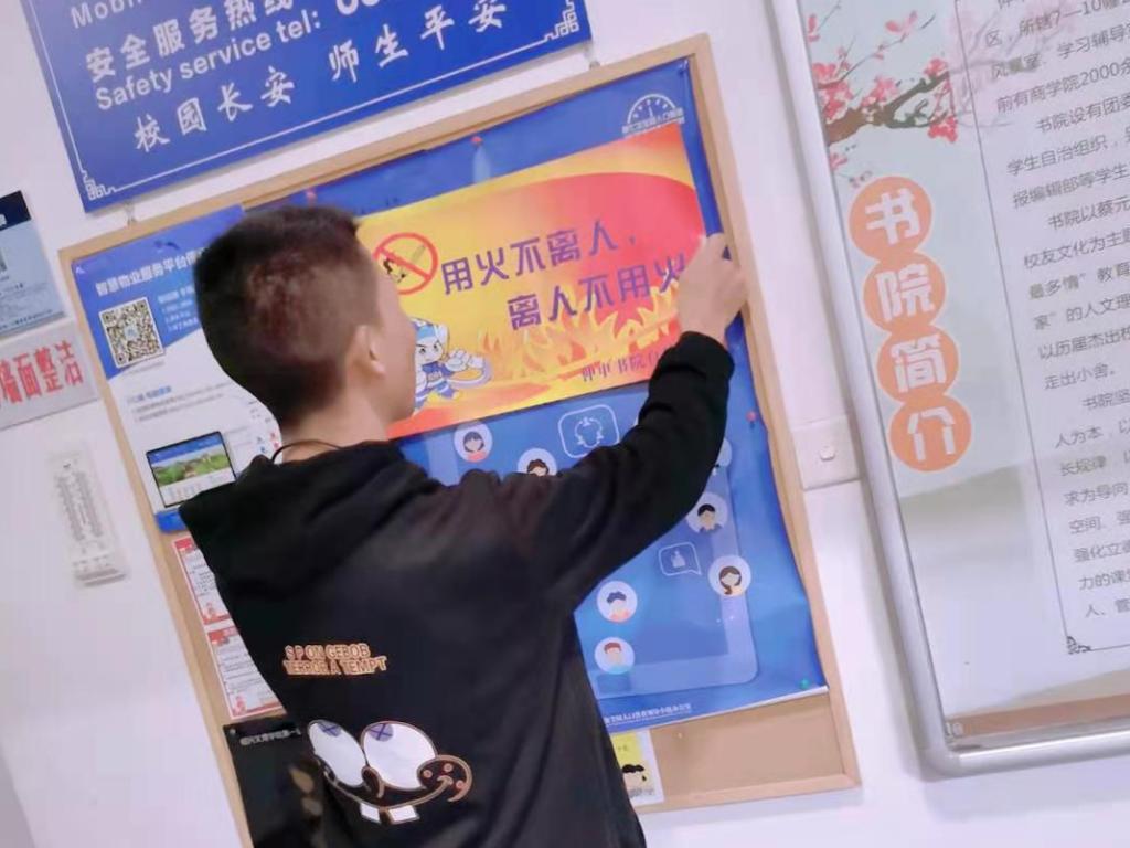 自管会此次印制了消防标语,并结合近期各地所发生的不同程度的火灾案例,现已向7、8、9、10四个幢区进行发放。同学们将印有“用火不离人,离人不用火”“有备无患保平安,人人把好防火关”“火灾来时莫乱套,疏散通道最重要”“防火没有旁观者,你我都是践行人”的标语张贴在幢区宣传栏上,并现场普及消防知识,借此加强学生们的消防安全意识,落实火灾防范措施,消除各类消防安全隐患,预防火灾事故的发生。